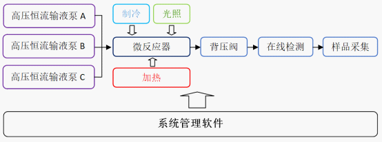 如圖所示,物料通過高壓輸液泵輸送到微反應(yīng)器中,在高壓密閉的微通道管路中,通過溫度控制,,使合成反應(yīng)能夠快速完成并極大提高收率,背壓閥能夠人為控制反應(yīng)器內(nèi)壓力,物料在出口處通過在線檢測器檢測合成結(jié)果,經(jīng)過檢測后的產(chǎn)品可通過樣品采集器按預(yù)設(shè)的收集條件收集到不同的容器中。整個反應(yīng)系統(tǒng)可通過管理軟件實現(xiàn)自動控制,具有方法建立、模塊搭建、模塊參數(shù)設(shè)置,全反應(yīng)過程參數(shù)實時監(jiān)控,數(shù)據(jù)追溯,用戶管理及智能專家數(shù)據(jù)庫等功能,專用管理軟件可將整個反應(yīng)體系效率發(fā)揮到極致。