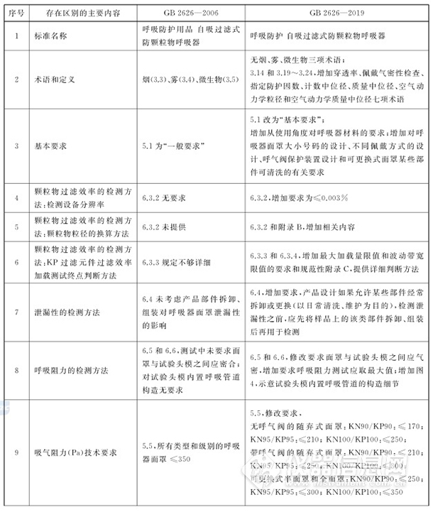 新標準在顆粒物過濾效率檢測方法(檢測設備分辨率、顆粒物粒徑的換算方法、KP過濾元件過濾效率加載測試終點判斷方法)、泄露性的檢測方法、呼吸阻力的檢測方法、呼吸阻力的技術要求、呼氣閥氣密性的技術要求和檢測方法、呼氣閥保護裝置的名稱、死腔的檢測方法、半面罩視野的技術要求、全面罩視野的技術要求、全面罩鏡片的技術要求、可燃性、清洗和消毒、制造商應提供的信息、使用性能、頭帶測試方法等方面的要求都進一步細化。