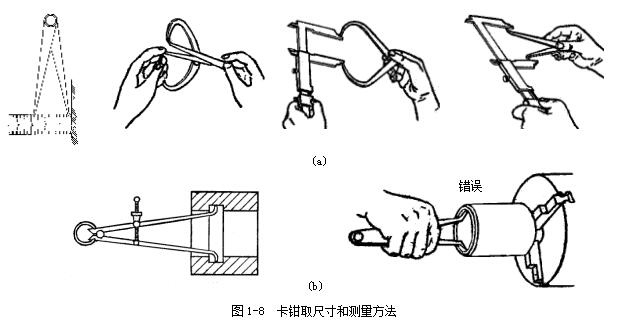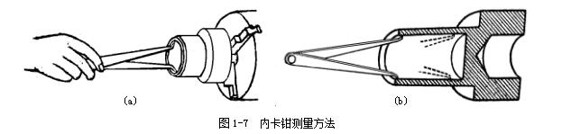 用巳在鋼直尺上或在外卡鉗上取好尺寸的內(nèi)卡鉗去測量內(nèi)徑,圖1-8a 所示。就是比較內(nèi)卡鉗在零件孔內(nèi)的松緊程度。如內(nèi)卡鉗在孔內(nèi)有較大的自由擺動時,就表示卡鉗尺寸比孔徑內(nèi)小了;如內(nèi)卡鉗放不進,或放進孔內(nèi)后緊得不能自由擺動,就表示內(nèi)卡鉗尺寸比孔徑大了,如內(nèi)卡鉗放入孔內(nèi),按照上述的測量方法能有1~2mm的自由擺動距離,這時孔徑與內(nèi)卡鉗尺寸正好相等。測量時不要用手抓住卡鉗測量,圖1-8b 所示,這樣手感就沒有了,難以比較內(nèi)卡鉗在零件孔內(nèi)的松緊程度,并使卡鉗變形而產(chǎn)生測量誤差。